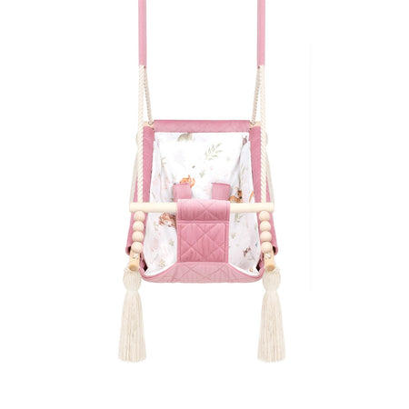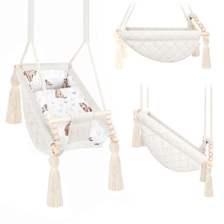 Ogni modello è realizzato con legno massello e corde in cotone regolabili fino a 180 cm, garantendo una sospensione stabile. Le cinture regolabili integrate aiutano a mantenere la seduta stabile, mentre il tessuto trapuntato aggiunge morbidezza e comfort al contatto.